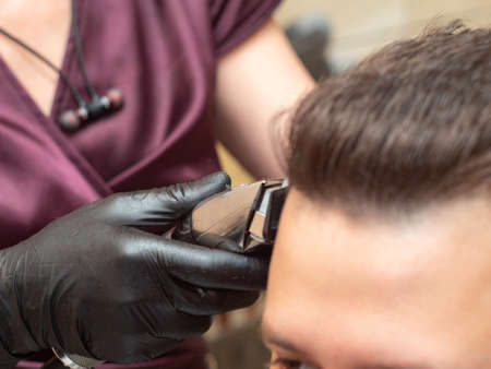 Stylist cutting males hair with clipper, close up view. Masters hands in black rubber gloves. Photographed in barbershop. Selective soft focus. Blurred background