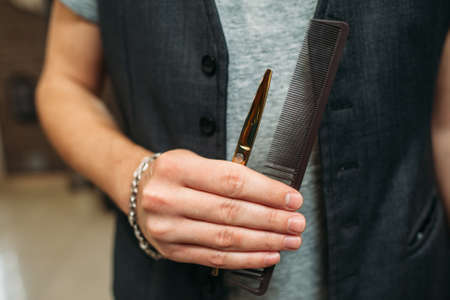 Stylist professional tools in hand closeup. Unrecognizable barber holding scissors and hair brush, free space for text. Hairdresser occupation background. Style, beauty concept