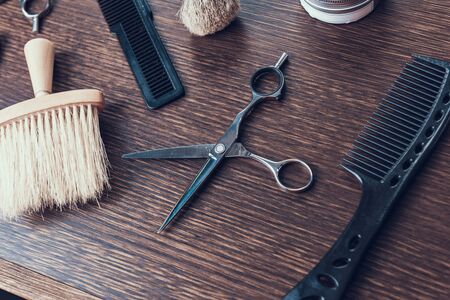 Hairdresser barber shop tools on old wooden background, copy space