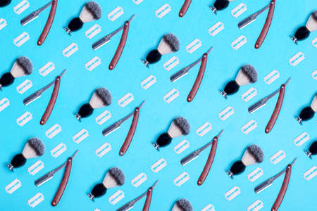 pattern of razors, brush and blade on blue background