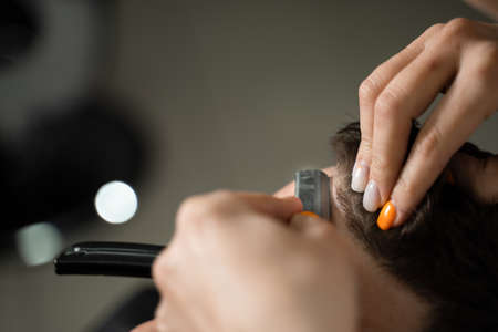 Straight razor cut man hair in barbershop. Attractive woman barber making hairstyle for handsome man