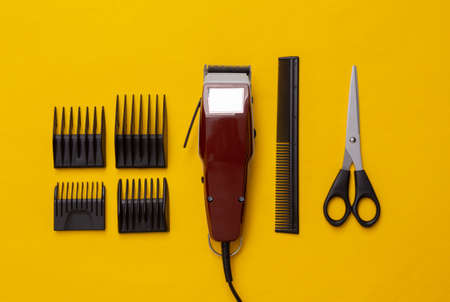 Machine for haircuts, scissors and comb on yellow background. Barbershop. hair clipper. top view. flat lay