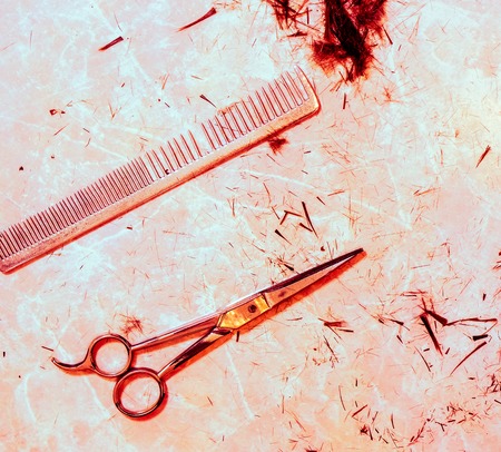 red light on open silver hair cutting shears and vintage metal steel comb against small spots of dark cutting hair and many small filaments on the table after haircut. Work still life of hairdresser