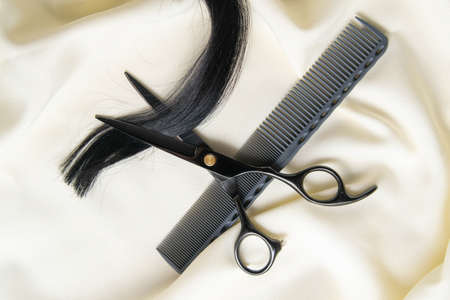 Lock of black hair ready for trim with comb and scissors. The hair is waving left to right and goes through the black comb. The scissors are laying on the hair. On the gold background.