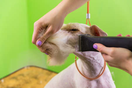 Fox terrier getting his hair cut at the groomer. Isolated on green background.