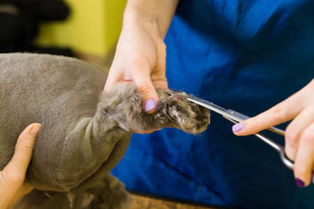 Cat grooming in pet beauty salon. The wizard uses the scissors for trimming tail.