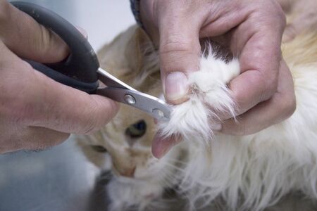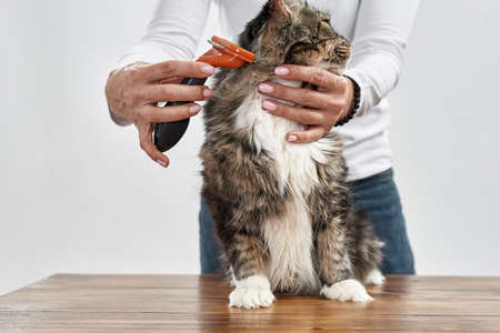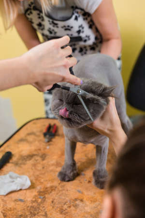 Cat grooming in pet beauty salon. The wizard uses the special cutters for trimming claws.