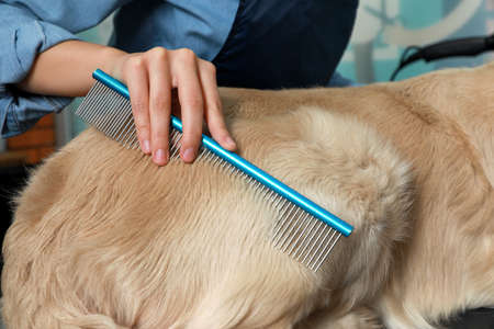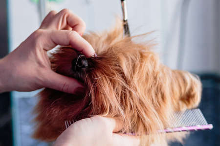 Dog gets hair cut at Pet Spa Grooming Salon. Closeup of Dog. the dog has a haircut. comb the hair. groomer concept.