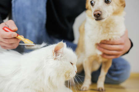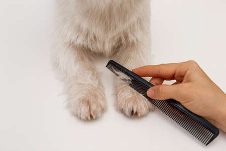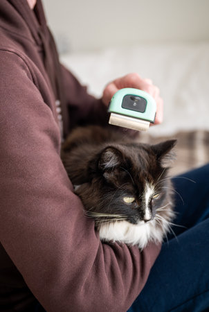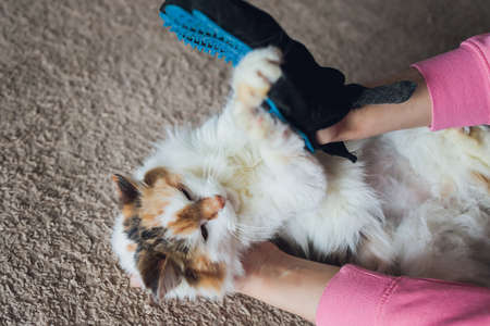 person brushing fur from domestic cat with furminator. cat grooming at home.