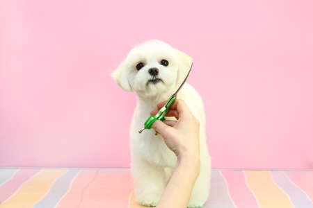 Haircut of a white little dog. Beautiful and funny dog. Maltese dog