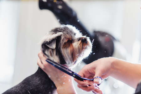 Grooming animals, grooming, drying and styling dogs, combing wool. Grooming master cuts and shaves, cares for a dog. Beautiful Yorkshire Terrier.