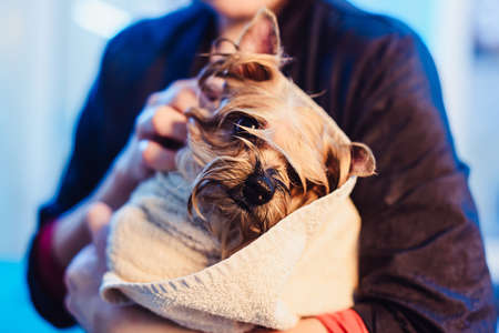 Portrait of a wet dog. Yorkshire Terrier in the bathroom in the beauty salon for dogs. in a towel on the hands close