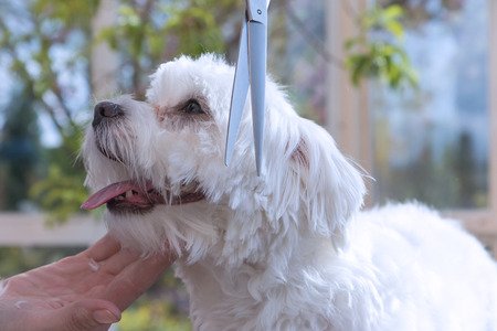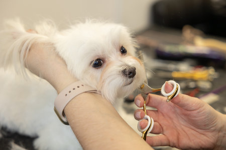dog Maltese in grooming salon portrait. Groomer trims dogs face