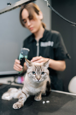 Vertical shot of female groomer cutting hair of domestic cat using electric razor for pet on animal salon. Master pet hairdresser giving professional service in veterinary clinic.