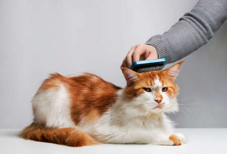 Care Maine Coon cat, combing hair brush for animals. Man's hand.