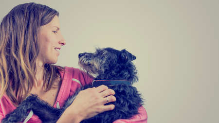 Loving young woman with her pet dog cradled in her arms as the two look lovingly at each other, vintage effect toned image.