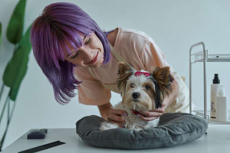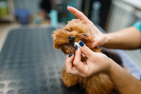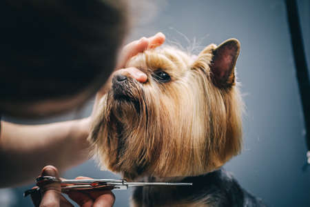 Female groomer haircut yorkshire terrier on the table for grooming in the beauty salon for dogs. process of final shearing of a dog's hair with scissors. muzzle of a dog view