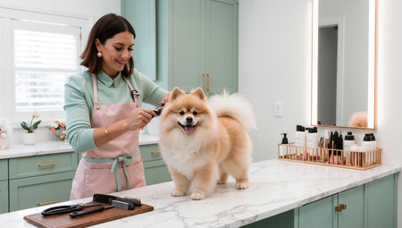 Young female groomer providing grooming service to smiling Pomeranian dog in stylish salon interior. Pet care businesses, grooming services, or veterinary marketing materials.