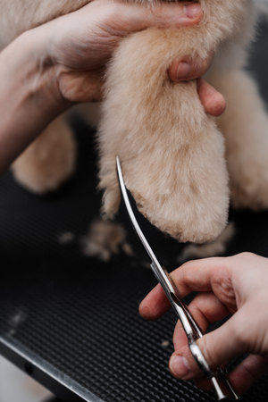 Professional groomer is trimming dog hair on paw of maltipoo to prevent puppy from slipping and sliding. Grooming workshop. Learning how to take care of pet hygiene
