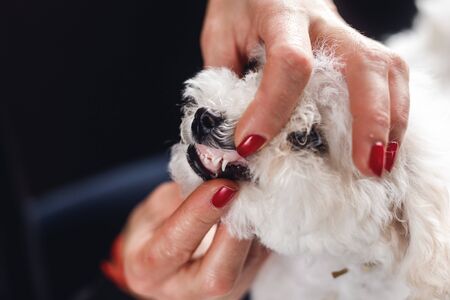 Exam of teeth Bichon Frize. Close up white fluffy dog