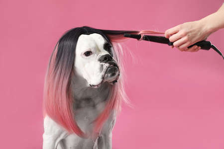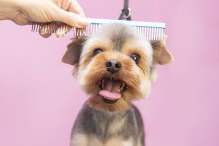 Dog gets hair cut at Pet Spa Grooming Salon. Closeup of Dog. the dog has a haircut. comb the hair. pink background. groomer concept.