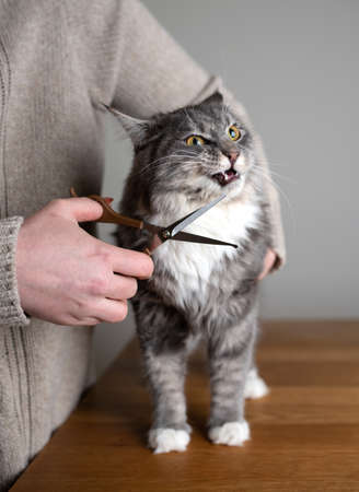 young blue tabby maine coon cat meowing and getting groomed by owner with scissors indoors on wooden table.