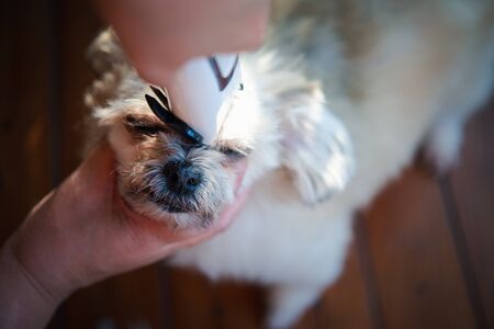 Grooming and haircut the dog fur of beige dog so cute mixed breed with Shih-Tzu, Pomeranian and Poodle by human with dog clipper in pet shop or pet groomer