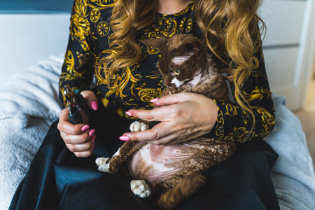 woman holding a clipper to cut claws of Devon Rex cat, pets concept. High quality photo