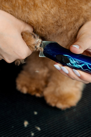 close up groomer cuts fur on paws dog with a mechanical trimer in grooming salon.