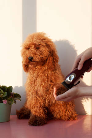 A small dog is a miniature poodle of red-brown color with a protruding sitting tongue. The hand holds a dogs paw and holds an animal clipper next to it