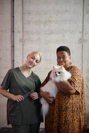 Caucasian young adult woman holding comb standing next to Black middle aged woman holding fluffy dog, both smiling and looking at camera against plain concrete wall