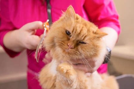 Cat grooming in pet beauty salon. The wizard uses the scissors for trimming the face.