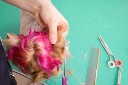 Female groomer haircut yorkshire terrier on the table for grooming in the beauty salon for dogs. Toned image. process of final shearing of a dog's hair with scissors. muzzle of a dog
