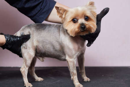 Female groomer haircut yorkshire terrier on the table for grooming in the beauty salon for dogs. Toned image. the process of combing a dog's fur. from the side view