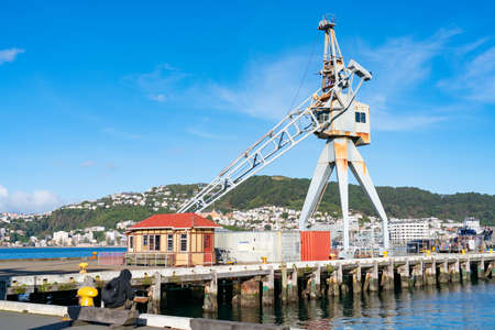 Old Wellington wharf on city waterfront with obsolete crane and small office building and hillside homes in distance, New Zealand.