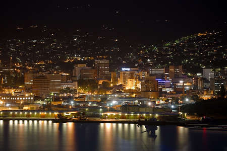 Wellington CBD and Wellington Harbour as seen from a high view point on a bright sunny day. Green mountains and quiet suburbian ares in the background. Wellington, New Zealand.