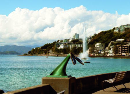 Wellington waterfront, The Carter Fountain and Tail of the Whale sculpture by Colin Webster-Watson