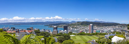 Scenic Panoramic skyline of Wellington downtown harbor and financial center in New Zealand.