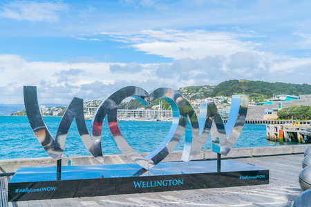 WELLINGTON, NEW ZEALAND - OCTOBER 1 2018; World of Wearable Art iconic shiny silver WOW sign on city waterfront reflects city and arbour scenes and hillside of Oriental Bay background.