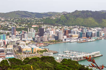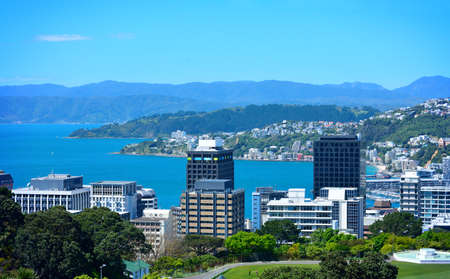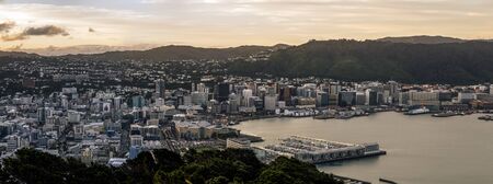 Scenic Panoramic skyline of Wellington downtown harbor and financial center in New Zealand.
