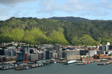 Wellington CBD and Wellington Harbour as seen from a high view point on a bright sunny day. Green mountains and quiet suburbian ares in the background. Wellington, New Zealand.