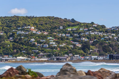 Wellington, New Zealand - September 18, 2022: People enjoying the beautiful day at Lyall Bay in Wellington, New Zealand
