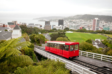WELLINGTON, NEW ZEALAND - DECEMBER 27, 2016: The Wellington Cable Car reaches the top of the hill. Wellington city - New Zealand's capital in the background.