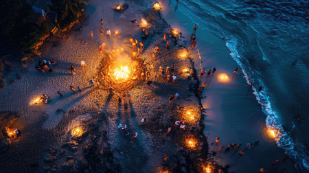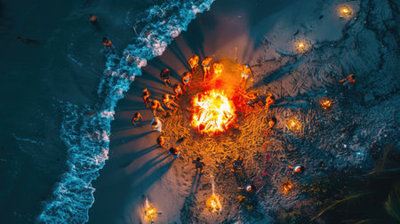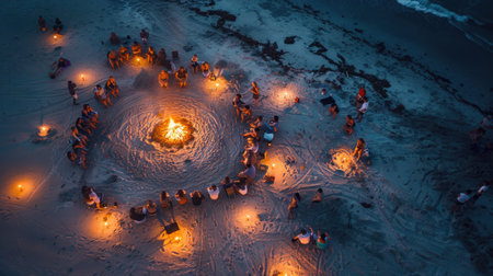 A circle of people gathers around a fire, seeking heat and comfort in the snowy landscape. The darkness enhances the art of the flames, creating a symmetrical and mesmerizing scene AIG50