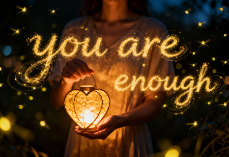 Young woman holding a glowing heart shaped lantern in her hands with text You are enough