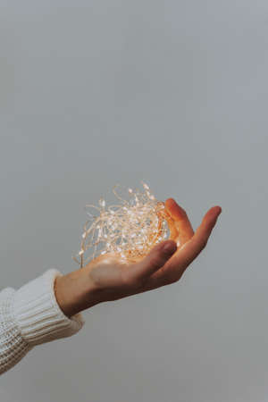 A vertical shot of a person holding a Christmas tree lights in its palm