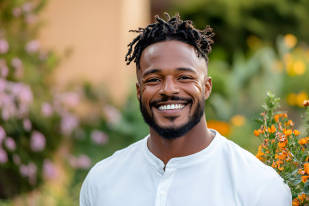 A close-up shot features a smiling man with a beard and short dark hair. The image displays warm tones with soft lighting. The composition highlights the man's expression, suggesting a positive mood. Suitable for various commercial uses, including advertising and editorial content.
