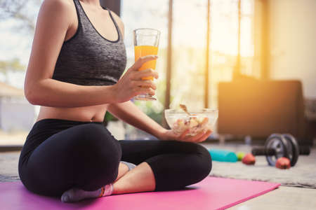 Fitness sport woman in fashion sportswear eating healthy salad fruit bowl. Healthy eating, dieting and exercise concept.