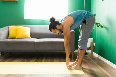 Warm-up exercises. Active young man stretching his body before starting a workout routine at home