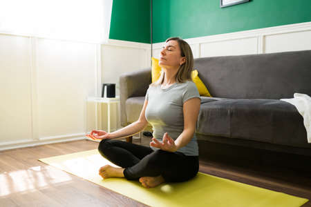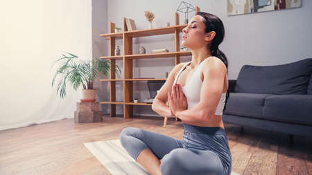 Calm young woman meditiating on yoga mat at home to increase self-awareness and focus on present
